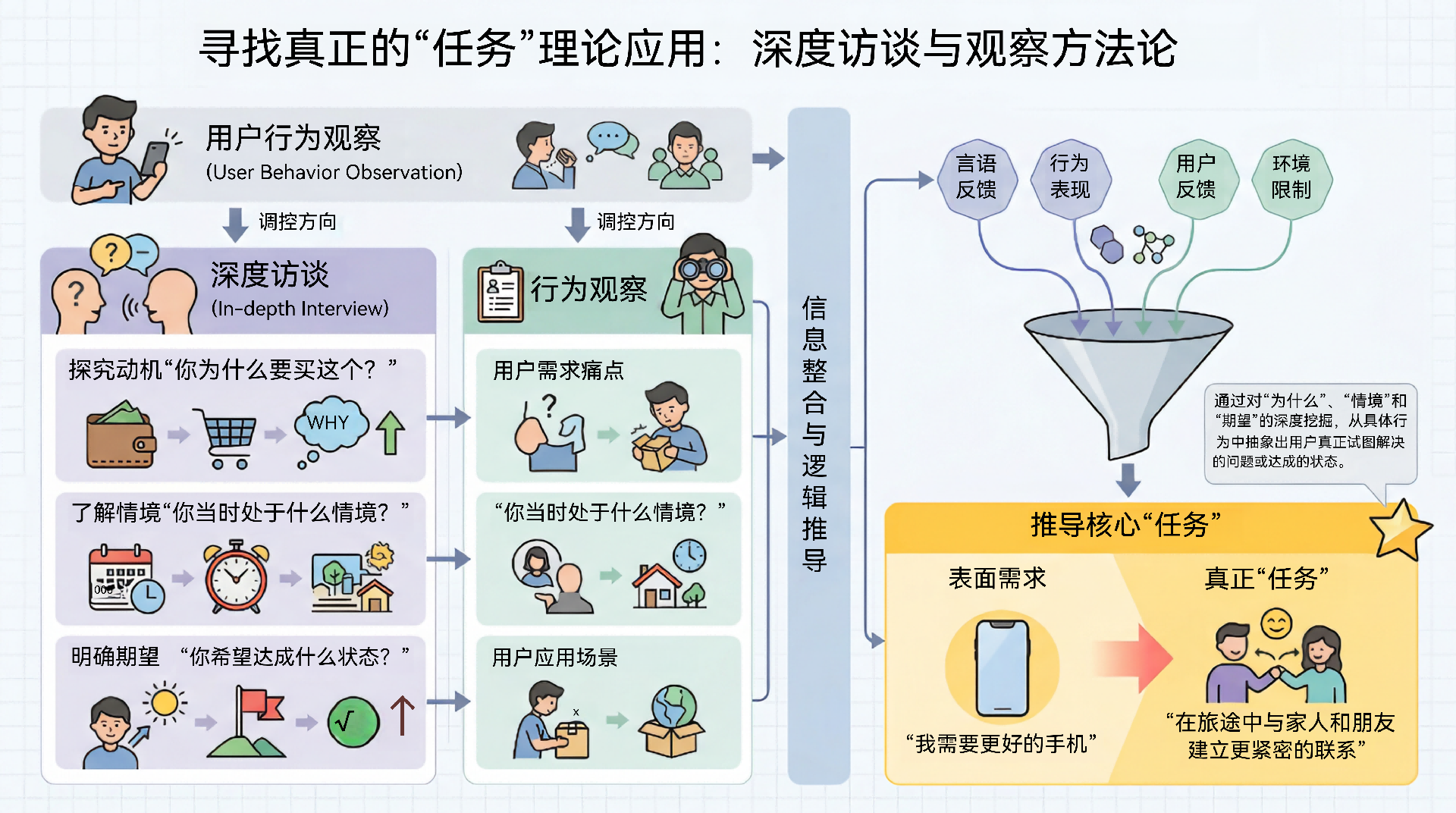 寻找真正的“任务”: 通过深度访谈和观察,问“为什么”?你为什么要买这个?你当时处于什么情境?你希望达成什么状态?